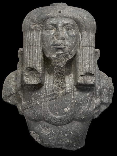 На изображении представлен бюст, выполненный из тёмного камня (вероятно, гранодиорит или базальт), изображающий мужчину в парике, который **не является традиционным для фараона** (у него нет урея или немеса). Это, судя по стилю, изображение военачальника, сановника или, что наиболее важно для нас, **иностранного правителя/военачальника** — идеальный кандидат для **Гиксоса** (**Хейн Хугсос**).