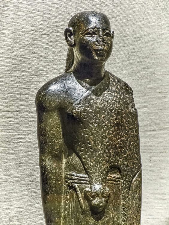 На изображении представлен бюст, выполненный из тёмного камня (вероятно, гранодиорит или базальт), изображающий мужчину в парике, который **не является традиционным для фараона** (у него нет урея или немеса). Это, судя по стилю, изображение военачальника, сановника или, что наиболее важно для нас, **иностранного правителя/военачальника** — идеальный кандидат для **Гиксоса** (**Хейн Хугсос**).